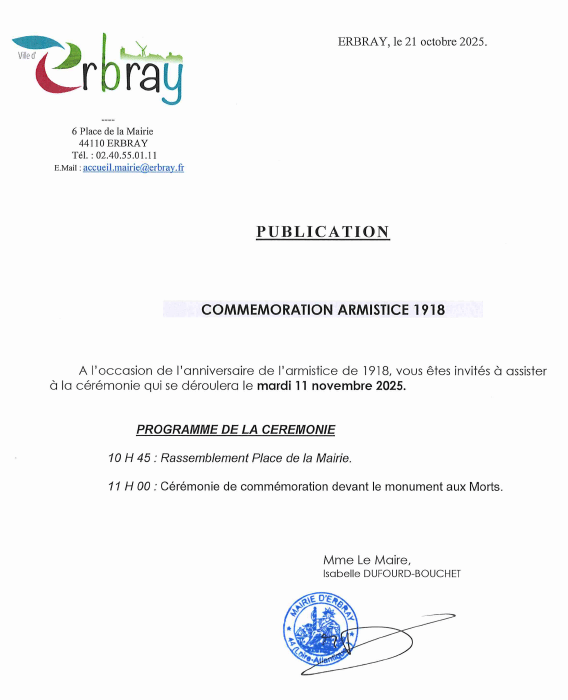 10H45 Rassemblement Place de la Mairie 11H Cérémonie de Commémoration devant le Monument aux Morts